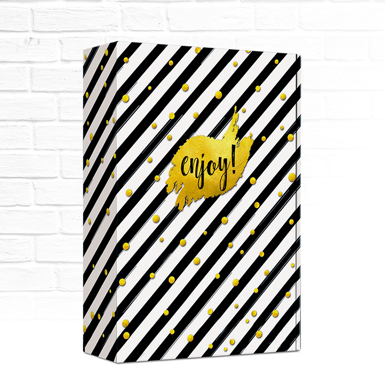 Karton prezentowy o gładkiej powierzchni w modne paski, wewnątrz zabarwiony na czarno, z czarnymi wstawkami, gotowy do wysyłki