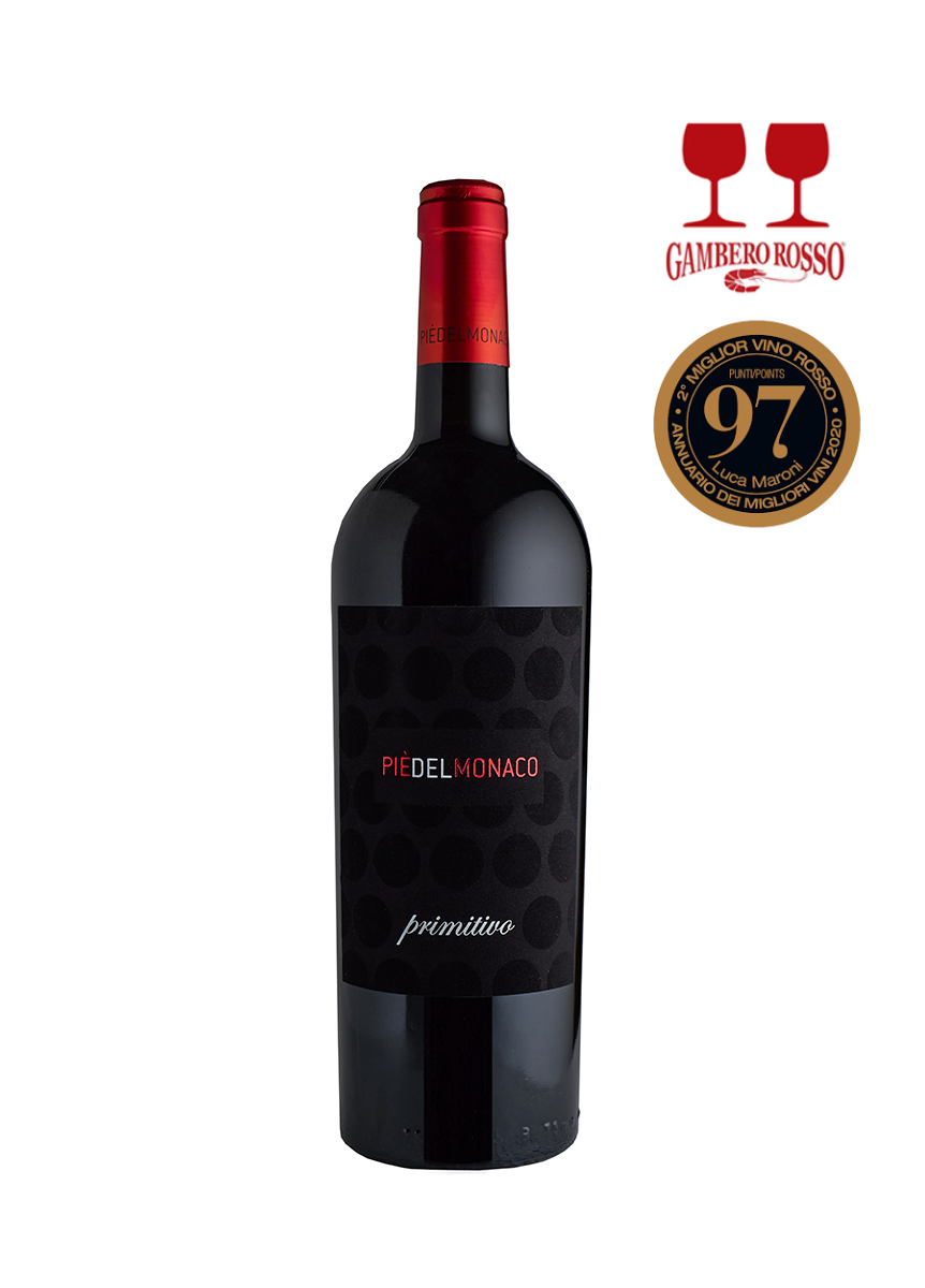 Pie’ del Monaco Primitivo Valle d’Itria zostało nagrodzone dwoma kieliszkami Gambero Rosso, 97 punktami u Luca Maroni.
